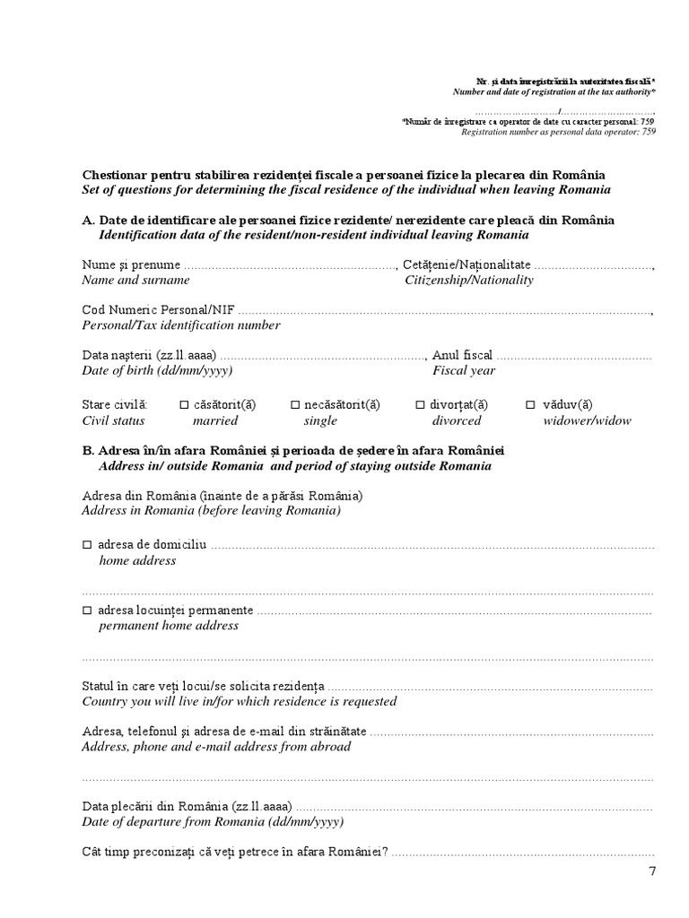 Chestionar Pentru Stabilirea Rezidentei Fiscale A Persoanei Fizice La Plecarea Din Romania