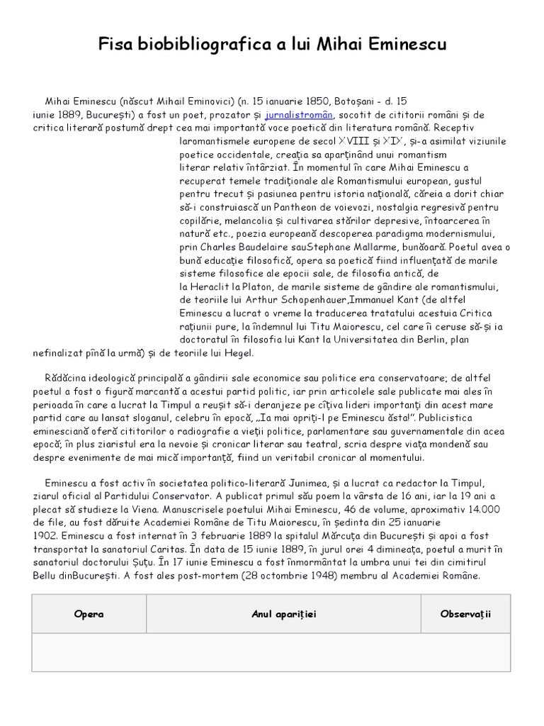 Fisa Biobibliografica A Lui Mihai Eminescu